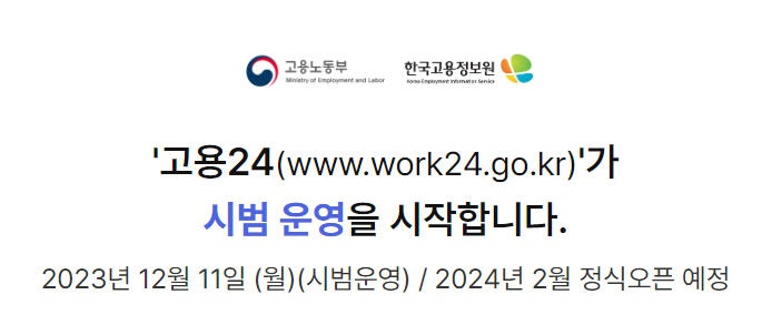 고용24 홈페이지는 2024년 2월 정식으로 오픈하며, 현재 모든 서비스가 아닌 일부 서비스만 제한적으로 시범운영 중에 있습니다. 고용24 홈페이지는 현재 시범 운영 중으로, 일부 고용24 오류나 이용에 불안정한 부분이 있을 수 있습니다. 고용24 오류로 인해 이용에 불편이 있으신 경우, 기존에 사용하시던 홈페이지를 방문하시기 바랍니다.