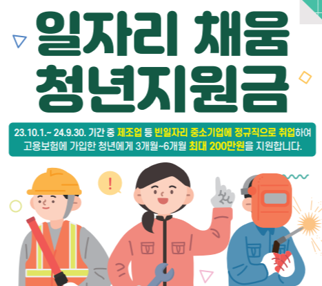 2023.10.1. ~ ’24.9.30 중 빈일자리 업종의 우선지원대상 기업에정규직으로 취업하여 고용보험에 가입한 청년에게 3개월 6개월 근속 시 각 100만원 지급 (최대 200만원)지원금을 지급하는 일자리 채움청년지원금 신청이 고용24 홈페이지에 1월24일부터 식작되었습니다. 일자리 채움 청년지원금은 빈 일자리 청년취업지원금으로 빈일자리 업종 중소기업과 청년 간 일자리 미스매치해소와 중소기업 취업 청년의 임금격차 완화에 목적이 있으며 예산·지원규모로는 24년 499억원, 청년 24,800명 내외 지원 할예정입니다.