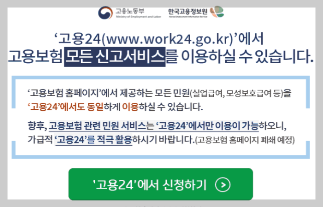 2024년 부터 운영하고 있는 고용24 홈페이지에 회원으로 가입하시면 실업급여신청, 실업인정, 구인·구직 및 직업교육 신청 등을 고용 관련 서비스를 한곳에서 편리하게 이용할 수 있습니다. 또한 회원가입시 개인과 기업회원에게 주요 서비스를 안내 하고 있으며 내 신청 조회, 증명서 발급,놓치고 있는 혜택 확인,채용정보및 일자리, 교육훈련, 자격증 추천과 기업회원에게는 각종 기업이 필요하로하는 기업지원금, 정부정책, 각종 기업이 누릴수있는 정책을 한눈에 확인할 수 있는 이점이 있습니다. 아직 고용24 홈페이지에 미가입된 개인이나 기업이라면 지금이라도 고용24 홈페이지에 회원가입을 진행하여 개인과 기업이 놓치고있는 정책과 서비스를 지금 받아 보시기 바랍니다. 이후 점차적으로 고용24홈페이지로 통해 각종 고용관련 서비스를 제공하고 고용과련 서비스들이 고용24 홈페이지에 통합 완료된 시점으로 다른 홈페이지는 점차적으로 폐쇄 할 예정이오니 가급적으로 고용24 홈페이지에 회원가입하여 이용하시는것을 권해드립니다.