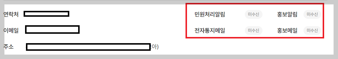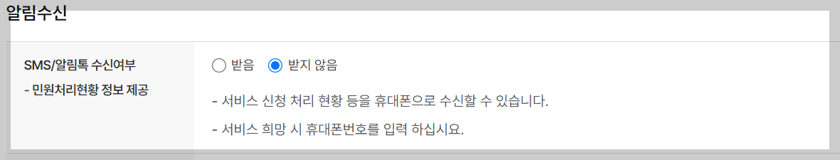 2. SMS/이메일 수신여부 설정 영역으로 민원처리정보 및 홍보 정보에 대한 SMS/이메일 수신여부를 설정합니다.