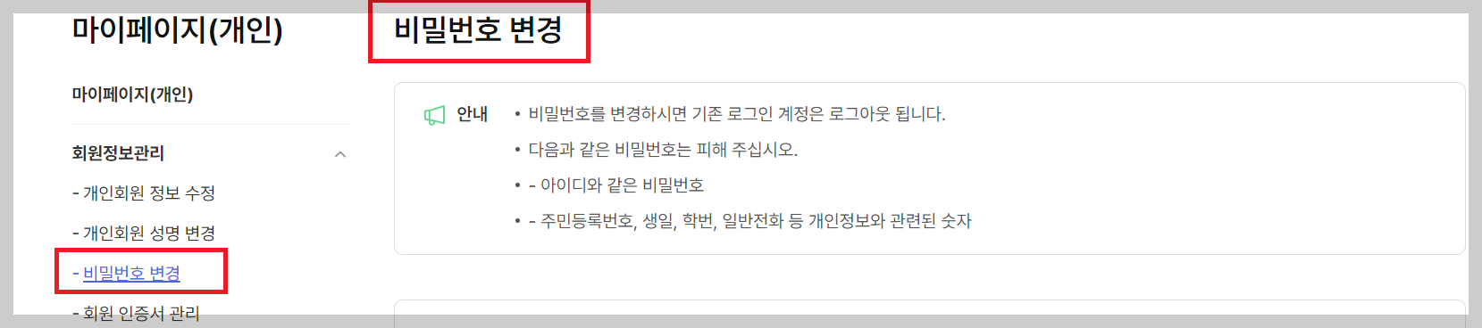 6.비밀번호 변경 변경을 원하는 비밀번호를 입력 후 변경 버튼을 눌러 변경을 완료합니다.