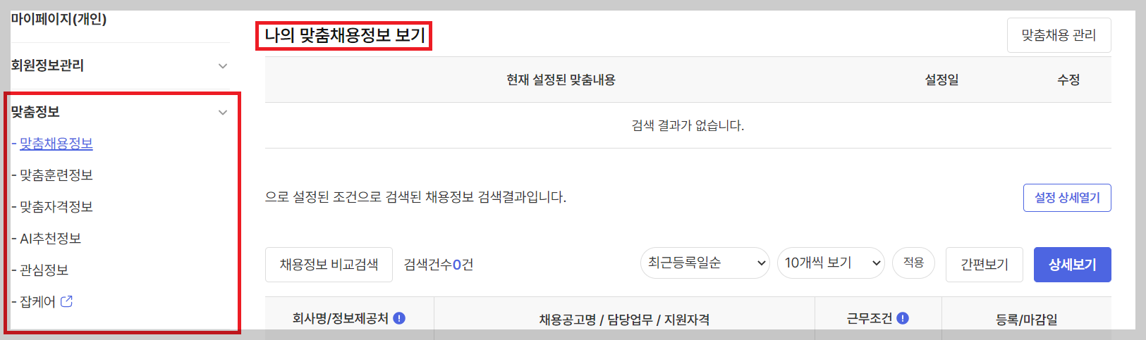 4. 맞춤형 서비스(고용 멤버십) 이용 영역으로 맞춤채용정보, 맞춤훈련정보, 자격정보, AI추천정보 관심정보, 잡케어 맞춤형 서비스(고용 멤버십) 이용 동의 여부를 확인하고 수정하는 영역입니다.