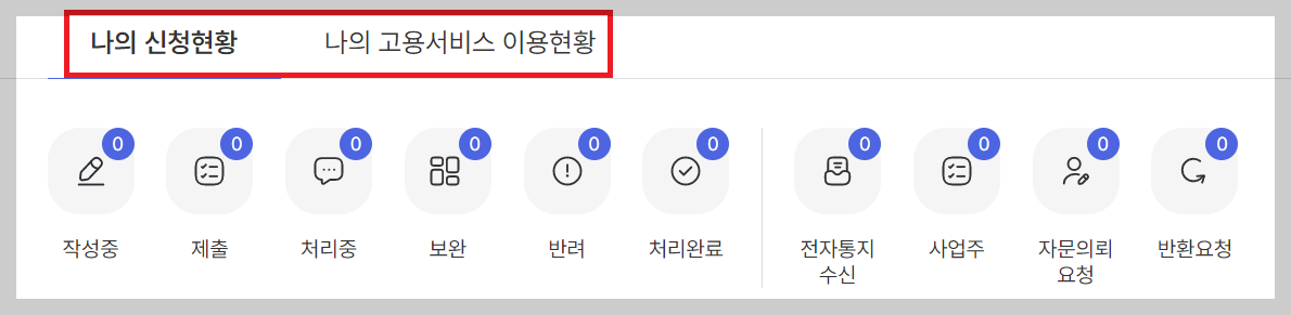 3. 나의 신청현황 및 나의 고용서비스 이용현황 영역은 신청현황 및 고용서비스 이용현황 건수를 확인 할 수 있으며, 클릭 시 해당 목록을 확인 할 수 있는 화면으로 이동합니다