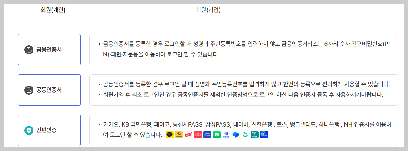 다양한 인증수단(간편인증, 공동인증서, 금융인증서, 카드인증, 아이핀인증) 중 원하는 인증수단을 선택하여 본인확인을 진행합니다. 본인확인이 완료되면 회원정보 조회 화면으로 이동합니다. 아이디/비밀번호를 이용한 본인 확인도 가능합니다.
