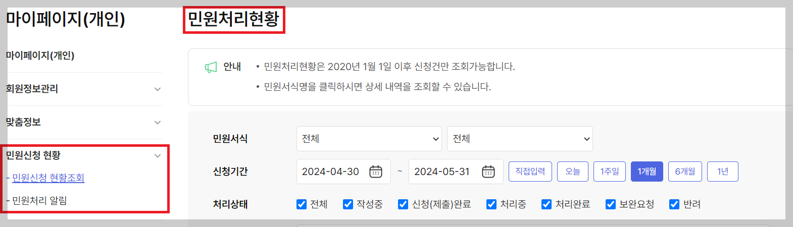 5. 민원처리현황은 2020년 1월 1일 이후 신청건만 조회가능합니다. 민원서식명을 클릭하시면 상세 내역을 조회할 수 있습니다. 전자통지문서는 [전자통지서비스 이메일 수신 여부]가 ‘수신함’으로 되어있는 회원에 한하여 발송됩니다.