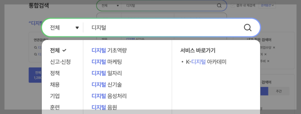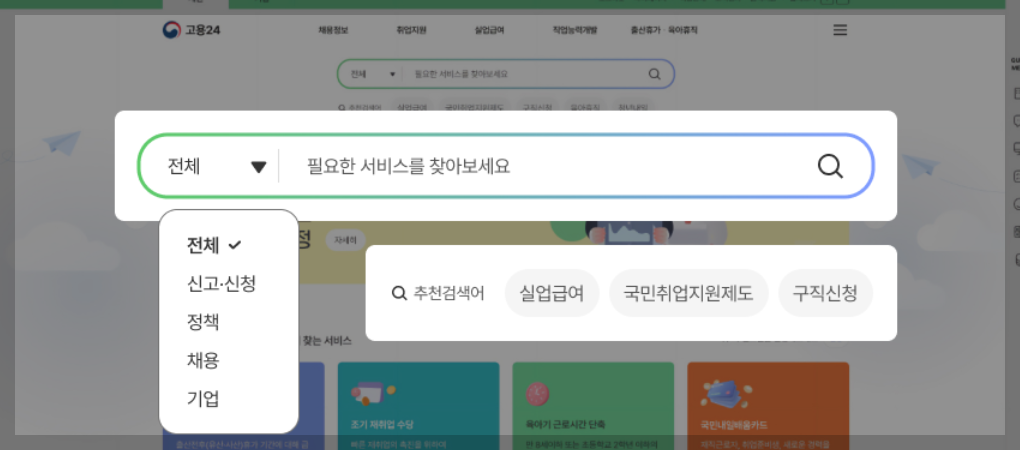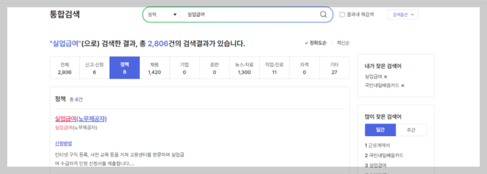 2. 서비스 바로가기 : 정책/제도 소개를 위한 자동검색어를 제공해드려요. 고용24 에서 서비스하는 메뉴를 바로 갈 수 있는 자동 검색어를 제공해드려요.