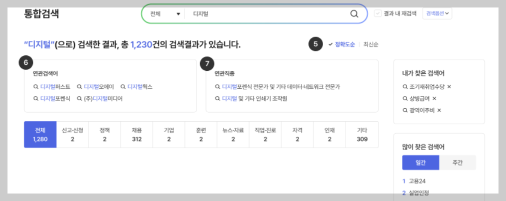 7. 연관직종 : 입력한 검색어와 연관된 직종을 확인하고, 해당 직종으로 등록된 구인/구직정보를 검색 할 수 있습니다.