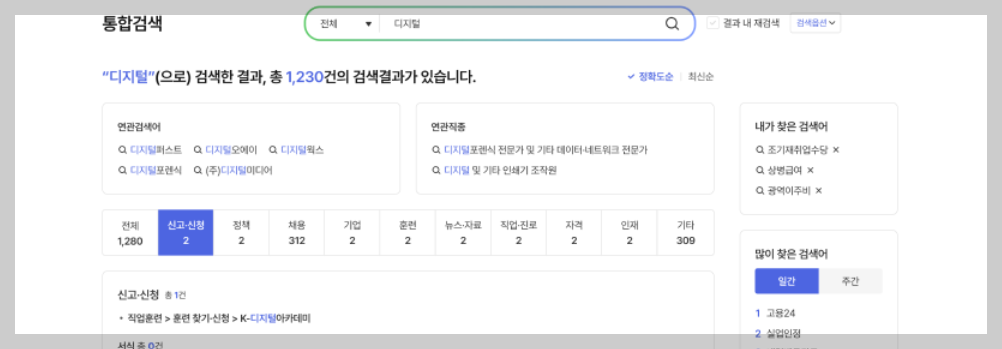 10. 검색 분야 : 전체(통합), 신고신청 서비스, 정책제도 정보, 채용정보, 기업정보, 훈련정보, 뉴스 및 자료실, 직업 및 진로정보, 자격증정보, FAQ 등 기타로 분류됩니다. 각 분야를 클릭하면, 해당 분야 내 검색내용만 확인하실 수 있습니다.