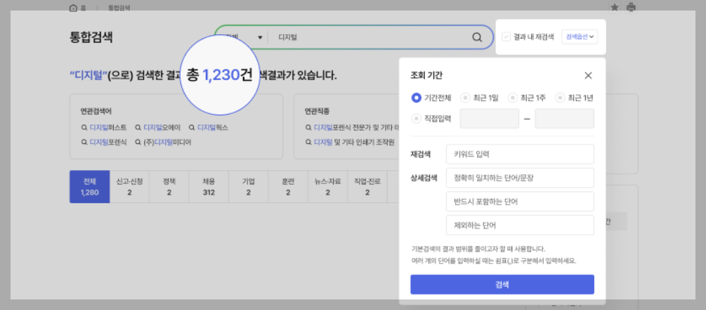4. 검색옵션 : 조회기간을 지정하거나, 반드시 포함할 단어, 제외하는 단어를 입력후 검색이 가능합니다.