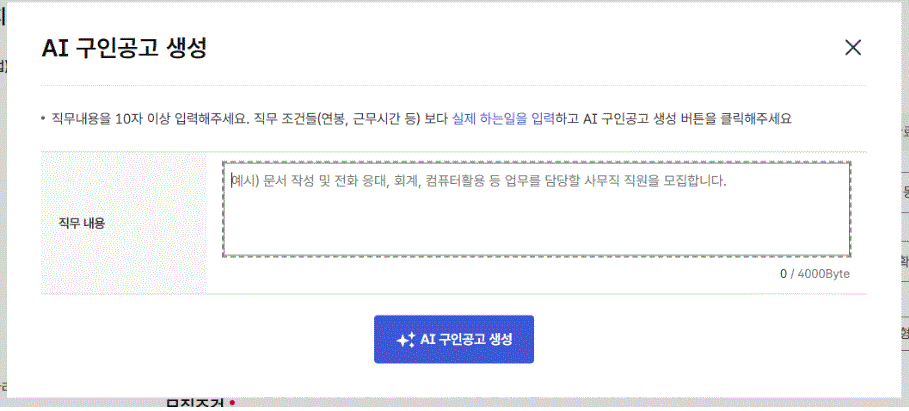AI구인공고 생성기능을 이용하기 위해서는 모집조건 중 직무내용을 10자 이상 입력해야 한다. 입력된 직무내용을 바탕으로 AI가 채용 직무의 특성을 분석하며, 해당 직무에 적합한 구인공고 구성 요소를 자동으로 생성한다. 이는 단순 키워드 입력이 아닌, 직무 중심의 공고 작성을 지원하는 방식이다.